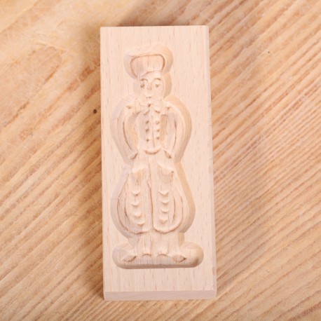 Old-fashioned beechwood speculaas mold. The speculaas is shaped like a man in costume. The board serves as a mold for the cookies, bake the speculaas on a baking sheet. Dimensions 10.5 x 4 cm.