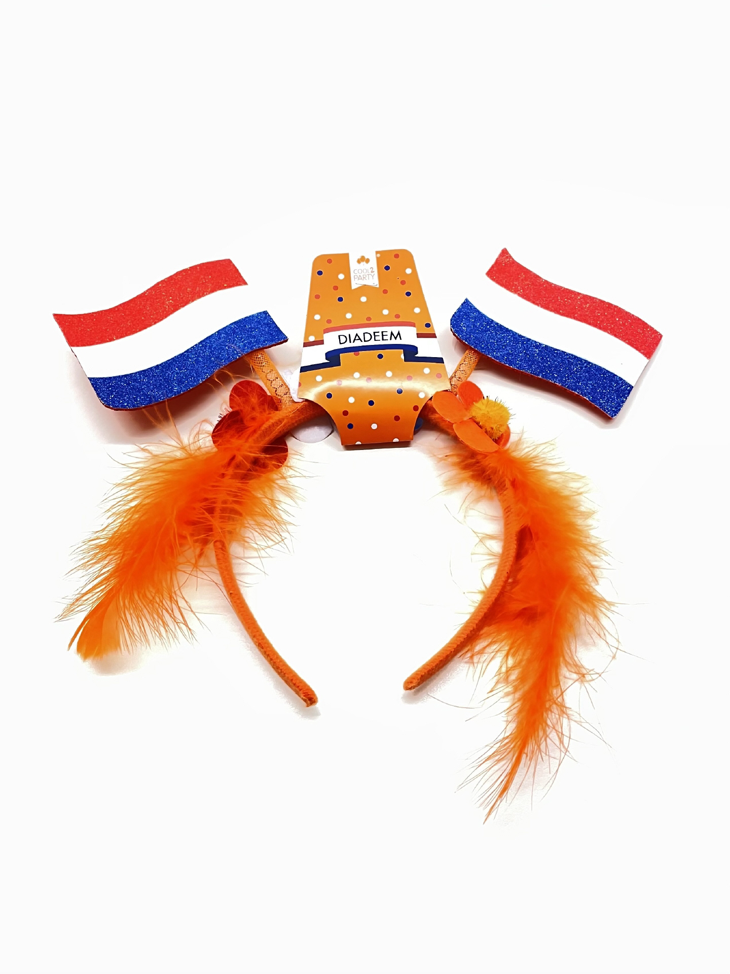 Met dit vrolijke diadeem met nederlandse vlaggetjes, oranje bloemetjes en veren ben je helemaal in stijl voor Koningsdag of andere festiviteiten van Oranje!