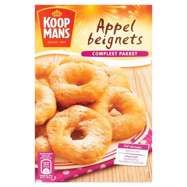 Zelf toevoegen: 250 ml melk, 5 zachtzure appels (bijv. Elstar of Jonagold) en zonnebloemolie om in te bakken. De verpakking bevat appelbeignetmix, kaneelsuiker en poedersuiker. Voor ca. 25 appelbeignets.