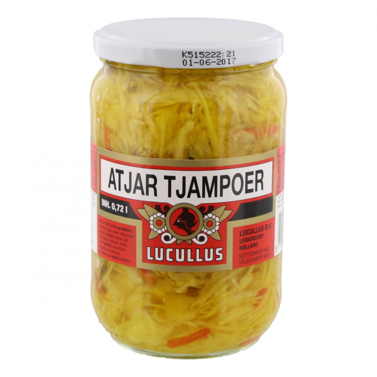 Atjar bedeutet eingelegte Gurken und Tjampoer bedeutet gemischt. Atjar Tjampoer ist eine frische süss-saure Zugabe von Mischgemüse zu vielen Gerichten.