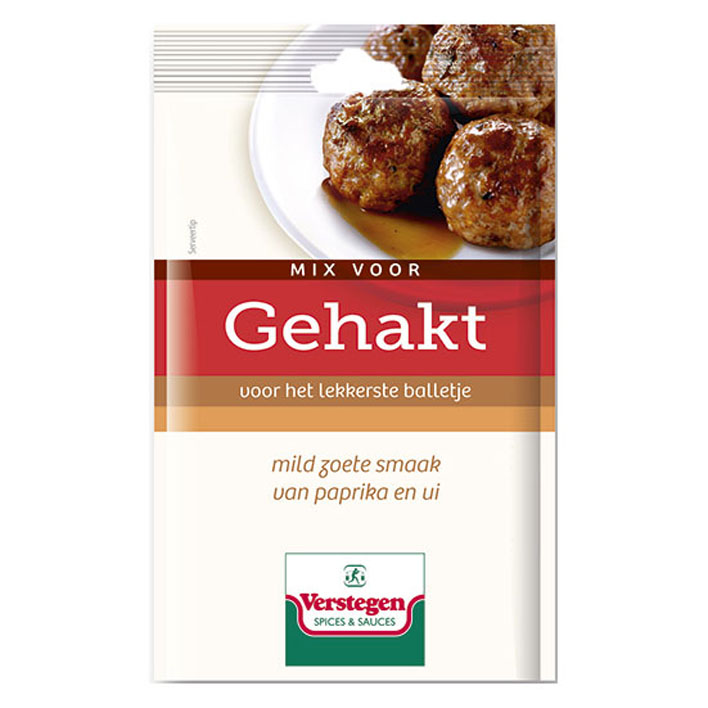 Traditionelle Mischung von Verstegen mit mildsüssem Geschmack von Paprika und Zwiebeln für 500 Gramm Hackfleisch. Füge je nach Geschmack ein Beschuit (Zwieback) oder etwas Paniermehl, eventuell auch ein Ei und eine Tasse Milch oder Wasser zu. Backe die Hackfleischbällchen auf mittlerer Stufe in 20 bis 25 Minuten.