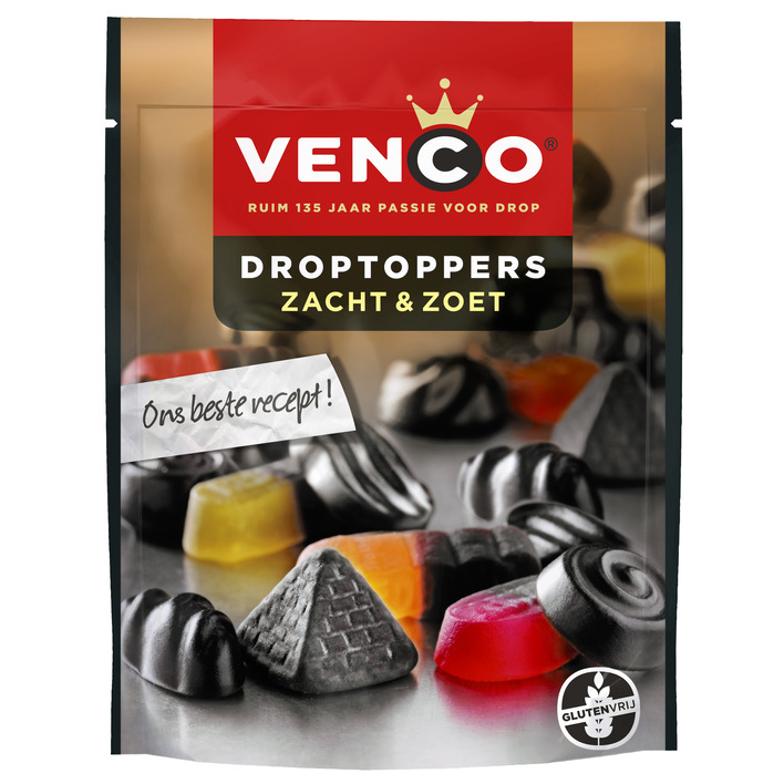 Droptoppers weich und süss: eine weiche Lakritzemischung mit Droptoefjes, Pyramiden und Lakritzefrucht-Duos. Glutenfrei.