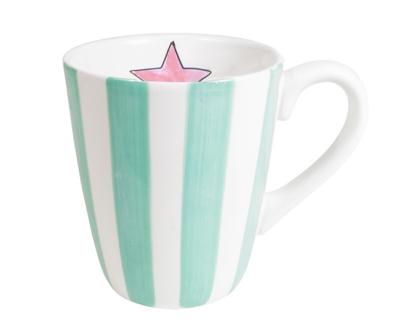 Die Even Bijkletsen Kollektion wurde mit neuen Items erweitert. Dieses Mal nicht mit den typischen Illustrationen, sondern mit farbenfrohen Streifen. Toll zum Kombinieren mit den übrigen Even Bijkletsen Artikeln oder anderen Kollektionen. Auf dieser Tasse stehen hellgrüne (mint) Streifen. Auf der Innenseite ist ein Stern abgebildet.