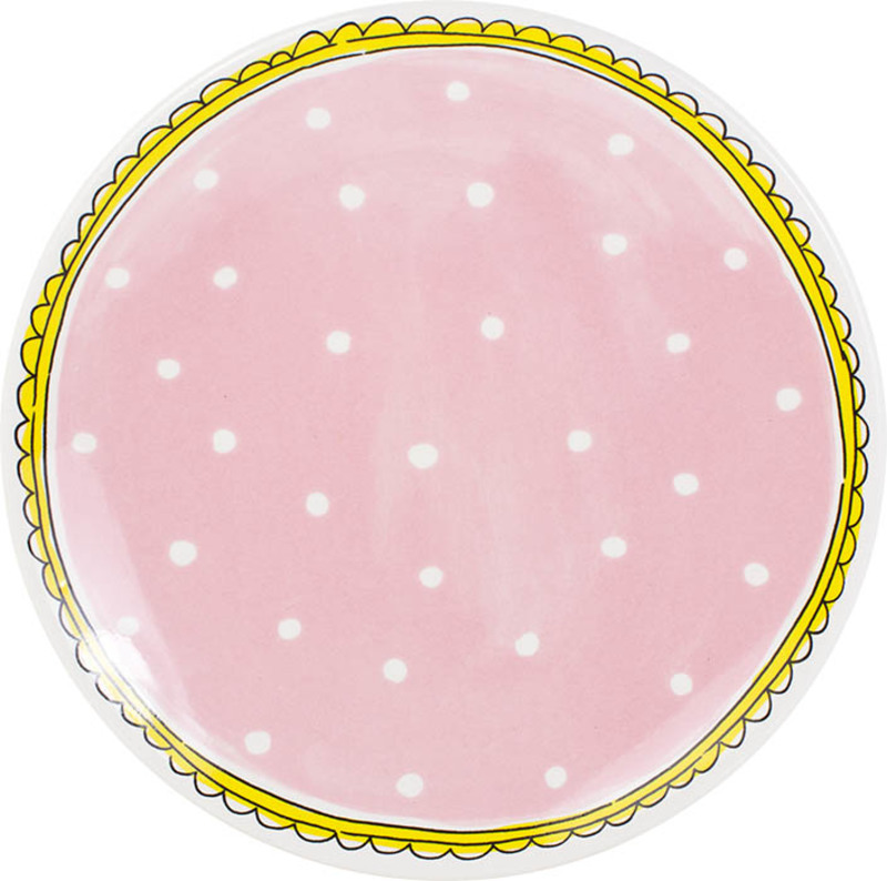 Der neue Dessertteller ist rosa mit weissen Punkten.