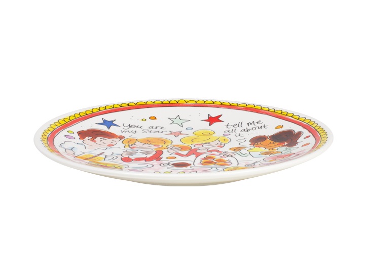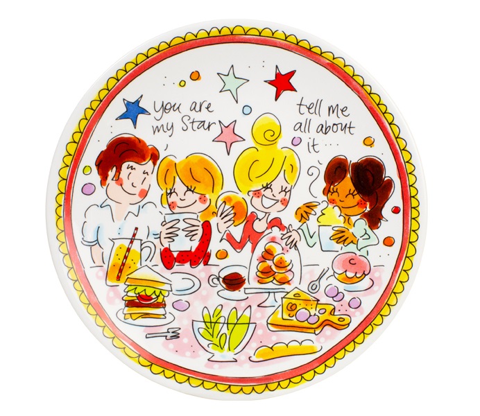 Die Kollektion Even Bijkletsen ist immer noch der grosse Favorit vieler Blond-Fans. Deshalb wurde diese Serie mit 12 supertollen Items erneuert. Die neuen Artikel lassen sich gut miteinander kombinieren, passen aber auch sehr gut zu den aktuellen Even Bijkletsen-Artikeln. Auf diesem Frühstücksteller sind unsere wiedererkennbaren, fröhlichen Illustrationen zu sehen, die von einem dekorativen Rand umgeben sind. Auf dem Frühstücksteller stehen Texte wie: "Du bist mein Star" und "Erzähl mir alles darüber".