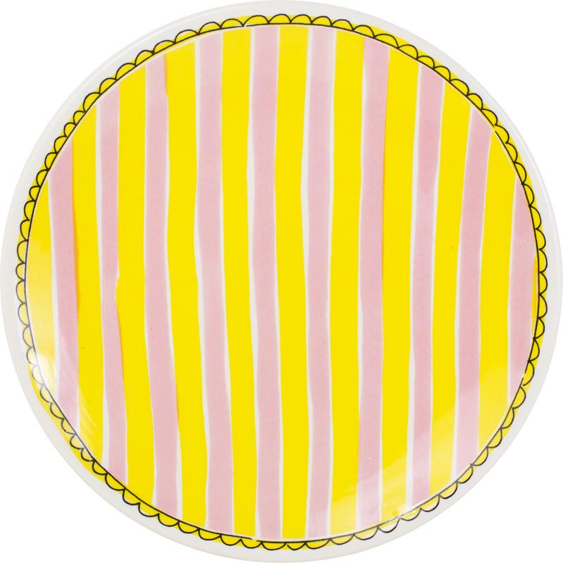 Der neue Frühstücksteller hat hellrosa und gelbe Streifen.