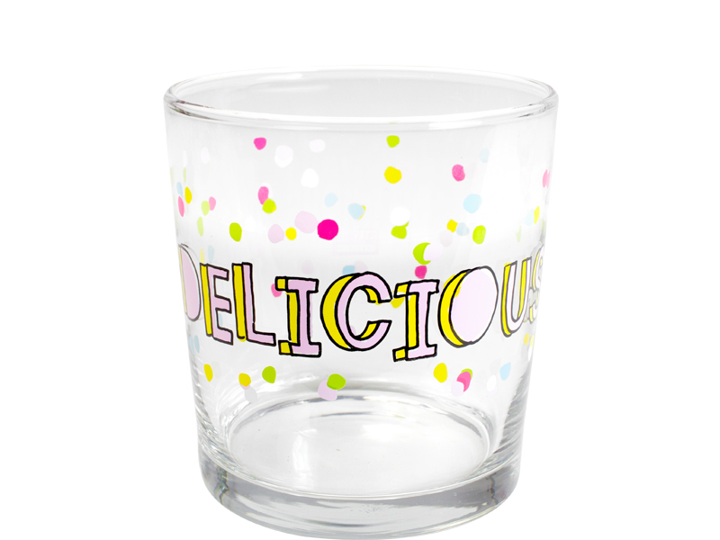Dieses fröhliche Saftglas von Blond Amsterdam mit farbigen Punkten und der Quote "Delicious" darf nicht fehlen in deiner Kollektion.