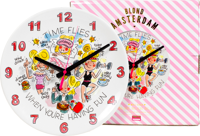 Die Even Bijkletsen Serie ist mit dieser Blond-Amsterdam Wanduhr erweitert worden. Auf der Keramik-Uhr sind Texte und Zeichnungen mit Bezug zu jeder Stunde abgebildet.