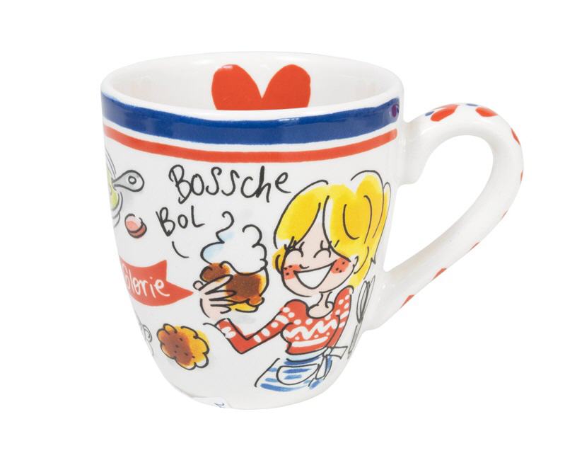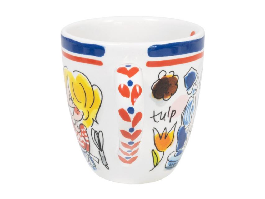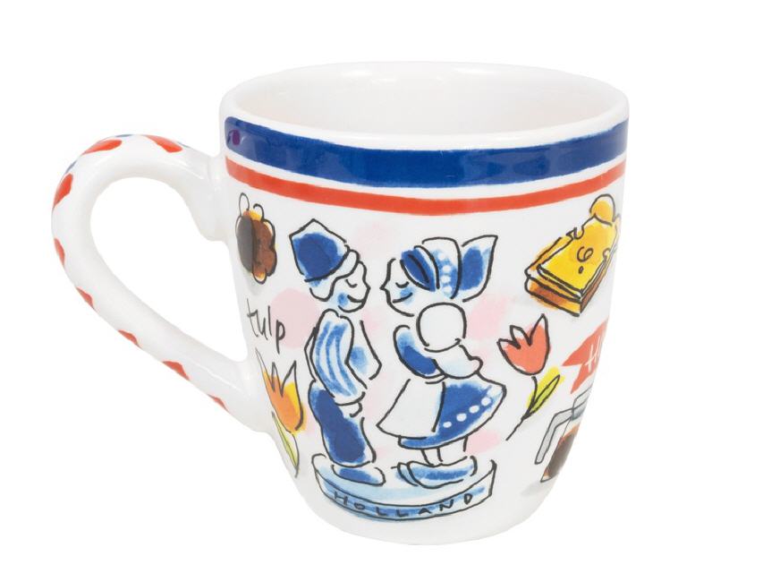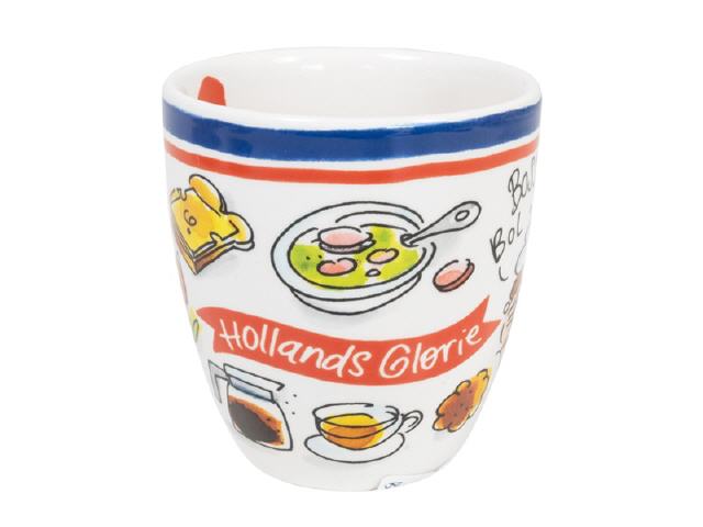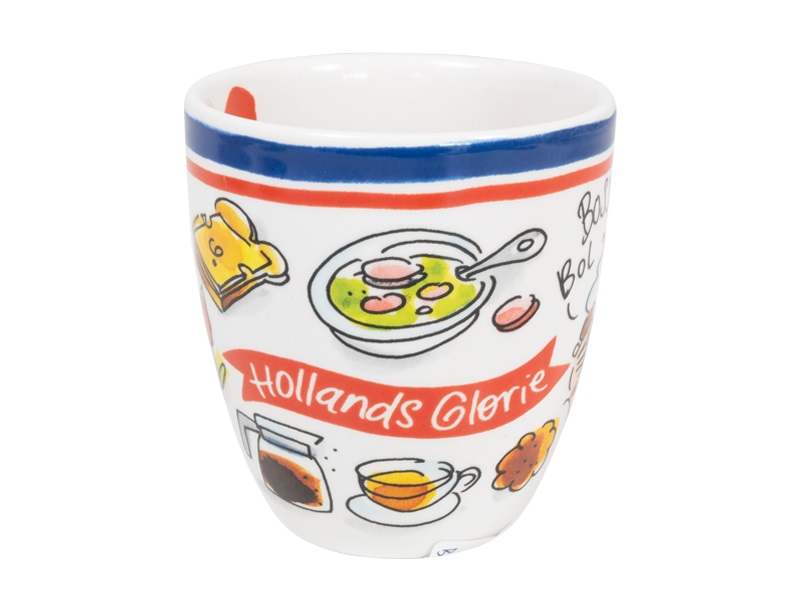 Die neue Serie Hollands Glorie von Blond Amsterdam ist in frischen Rot-/Weiss-/Blautönen gehalten und zeigt typisch niederländische Illustrationen. Dieser Minitasse Holland zeigt unter anderem Abbildungen des Bossche Bols, Tulpen und Erbsensuppe.