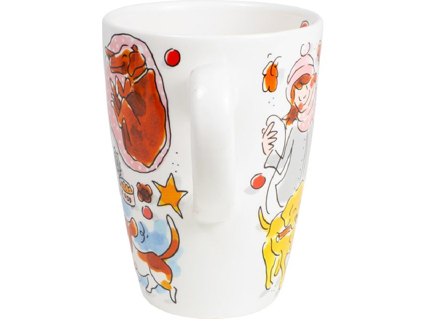 Liebst du Hunde? Dann ist dieser XL-Becher Dog Lover perfekt für Sie! Die Tasse, mit rundem Boden, zeigt alle Arten von Blond Illustrationen von verschiedenen Hunden. Auf dem Becher steht „Home is where my dog is“ und „Dog lover“.