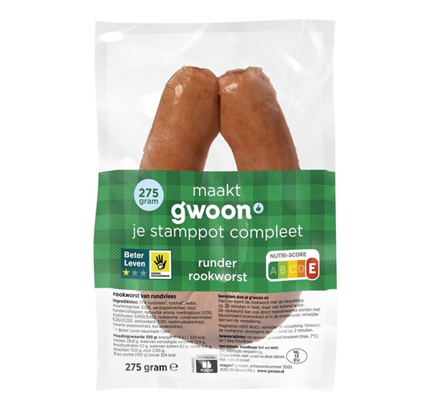77% rundvlees, rundvet, water, zuurteregelaar: E326, aardappelzetmeel, zout, rundercollageen, natuurlijk aroma, voedingszuur: E330, stabilisator: E450/E452, rookaroma, conserveermiddel: E261/E250, antioxidant: E301, nootmuskaatextract, zwarte peperextract, korianderextract.