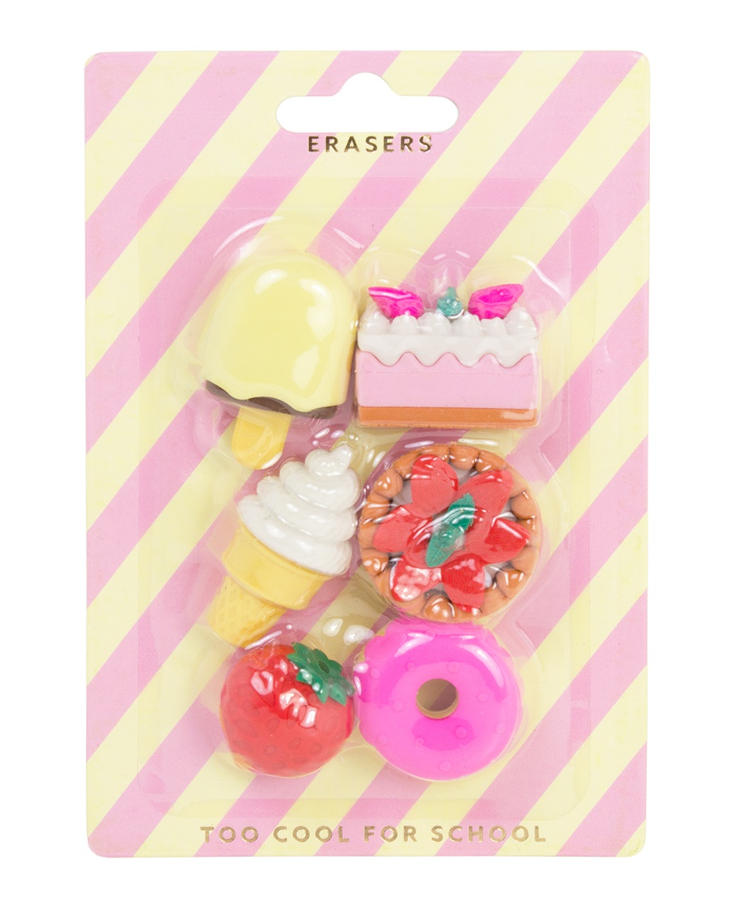 Met dit vrolijke setje gummetjes kun je snel je foutjes weggummen. Het setje bestaat uit 6 gummetjes in leuke 'zoetige' vormen.